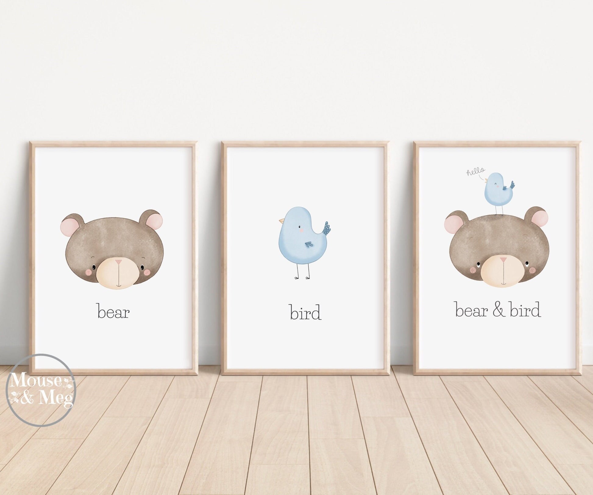 Bear, Bird, Wall Art, Nursery Print, Children's Prints, Kids Bedroom, Nursery, Boho, Cute, Scandi