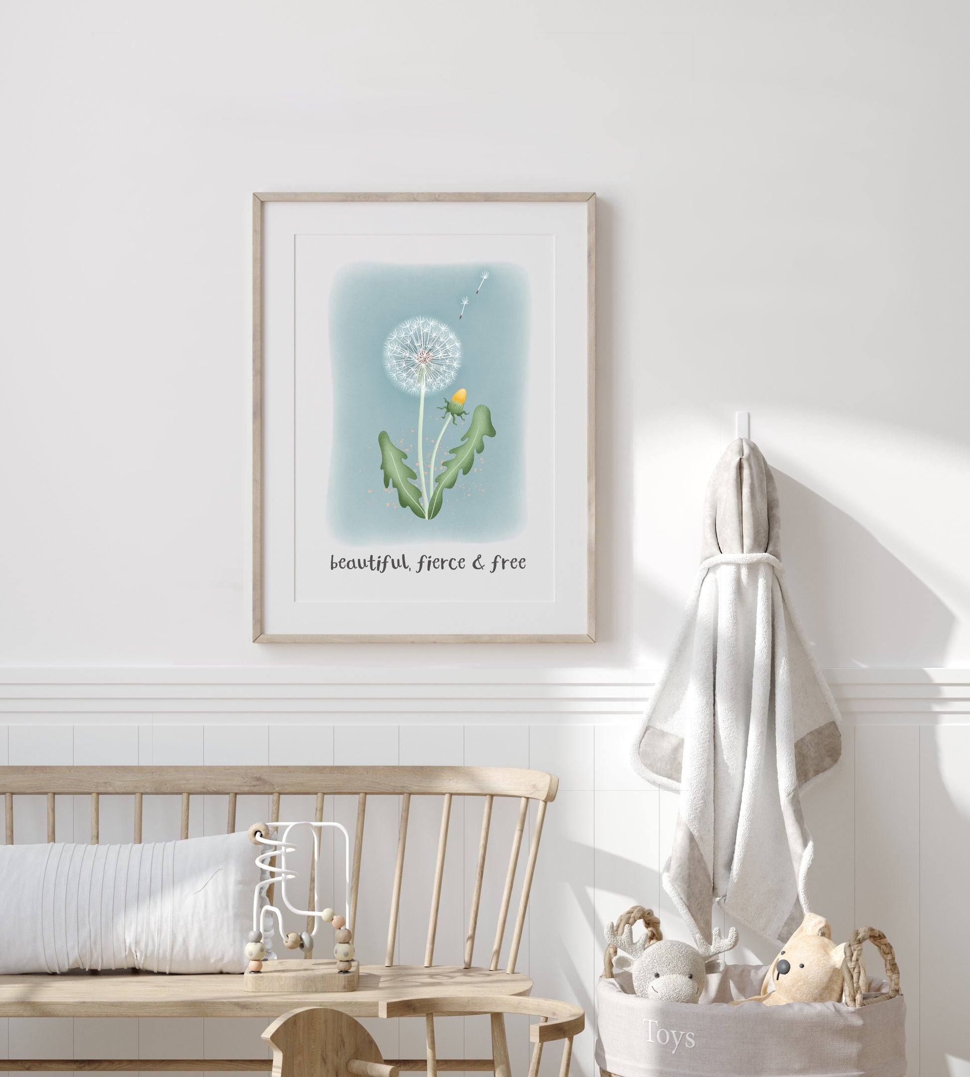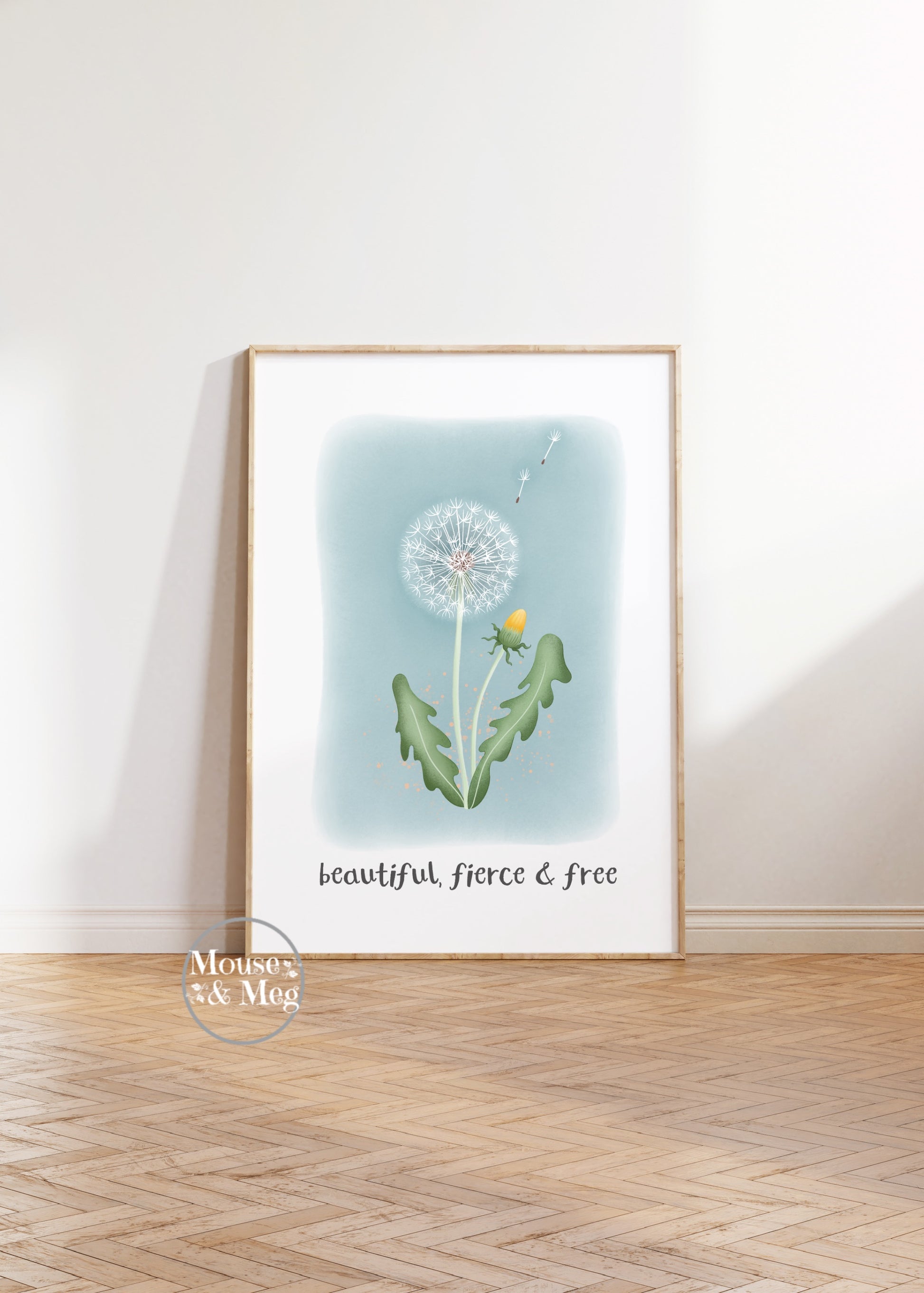 Original artwork by Laura Lawes of Mouse & Meg. Print featuring a whimsical dandelion clock and inspirational quote, perfect for any child’s nursery or playroom.