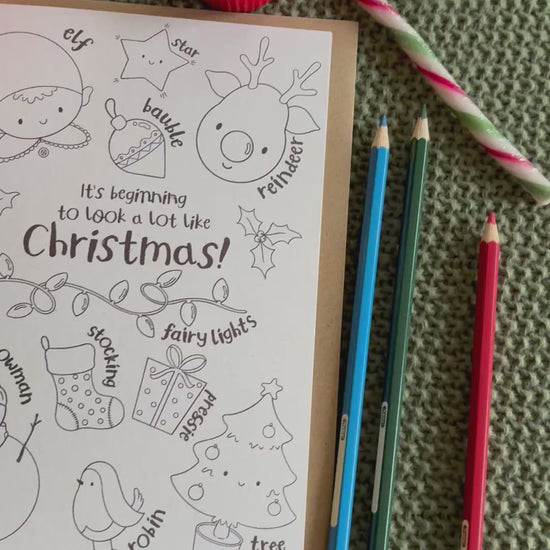 Lovingly designed with artwork by Laura Lawes of Mouse & Meg, this charming Christmas card features all of the things unique to Christmas in a black and white line drawing so they can be coloured in and decorated for that special personal touch. There is also space on the back for your little artist to sign their work.