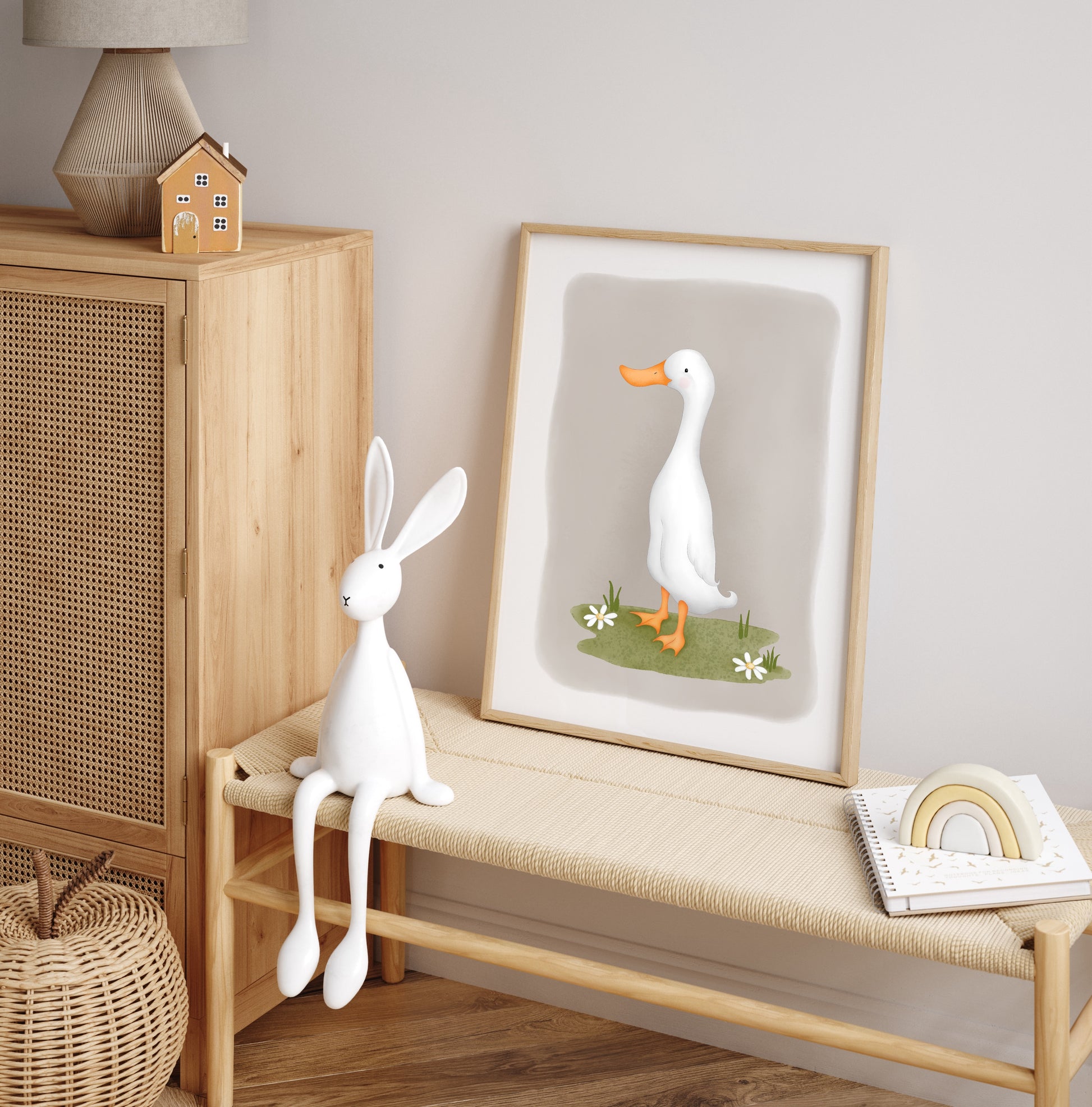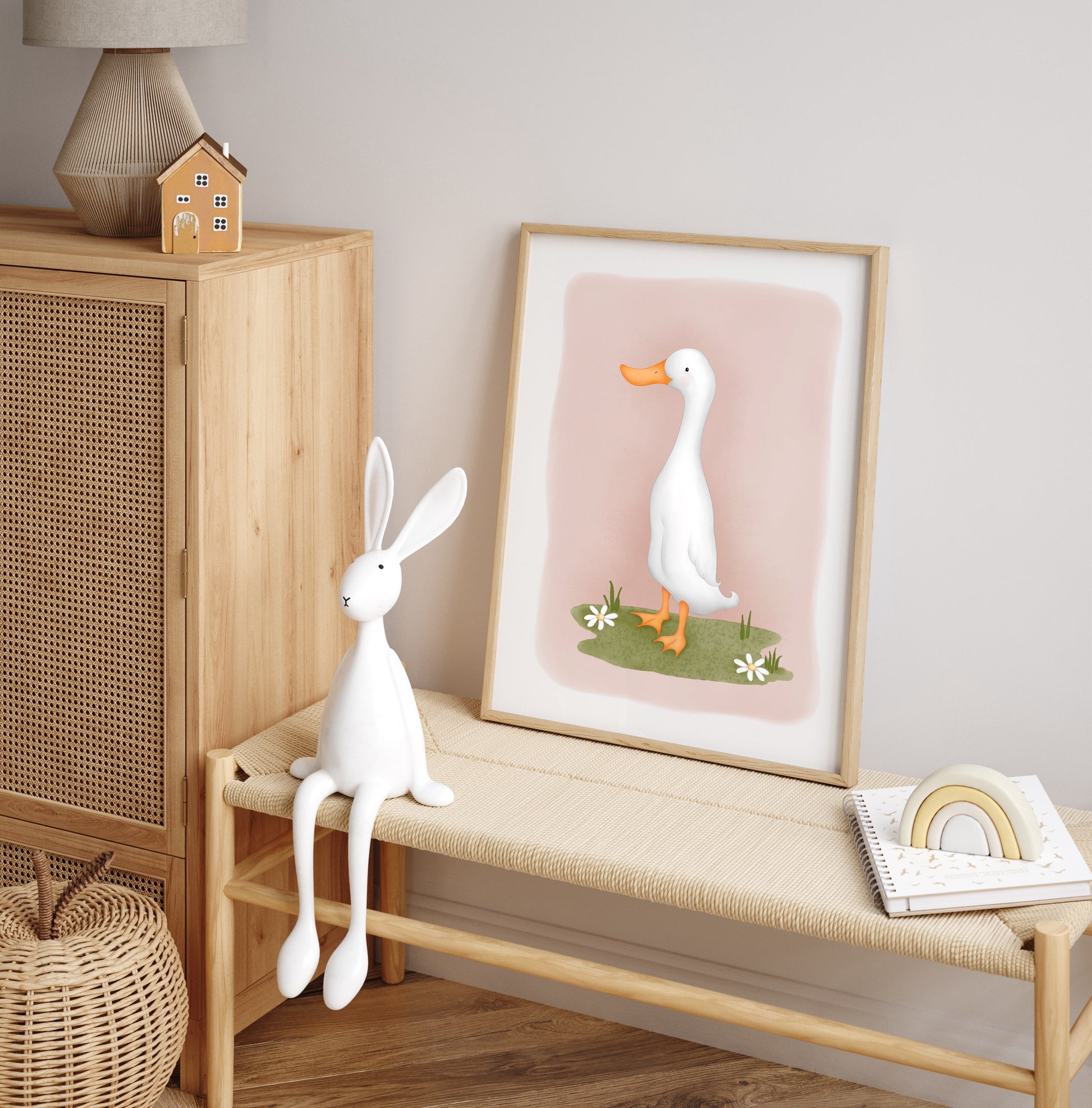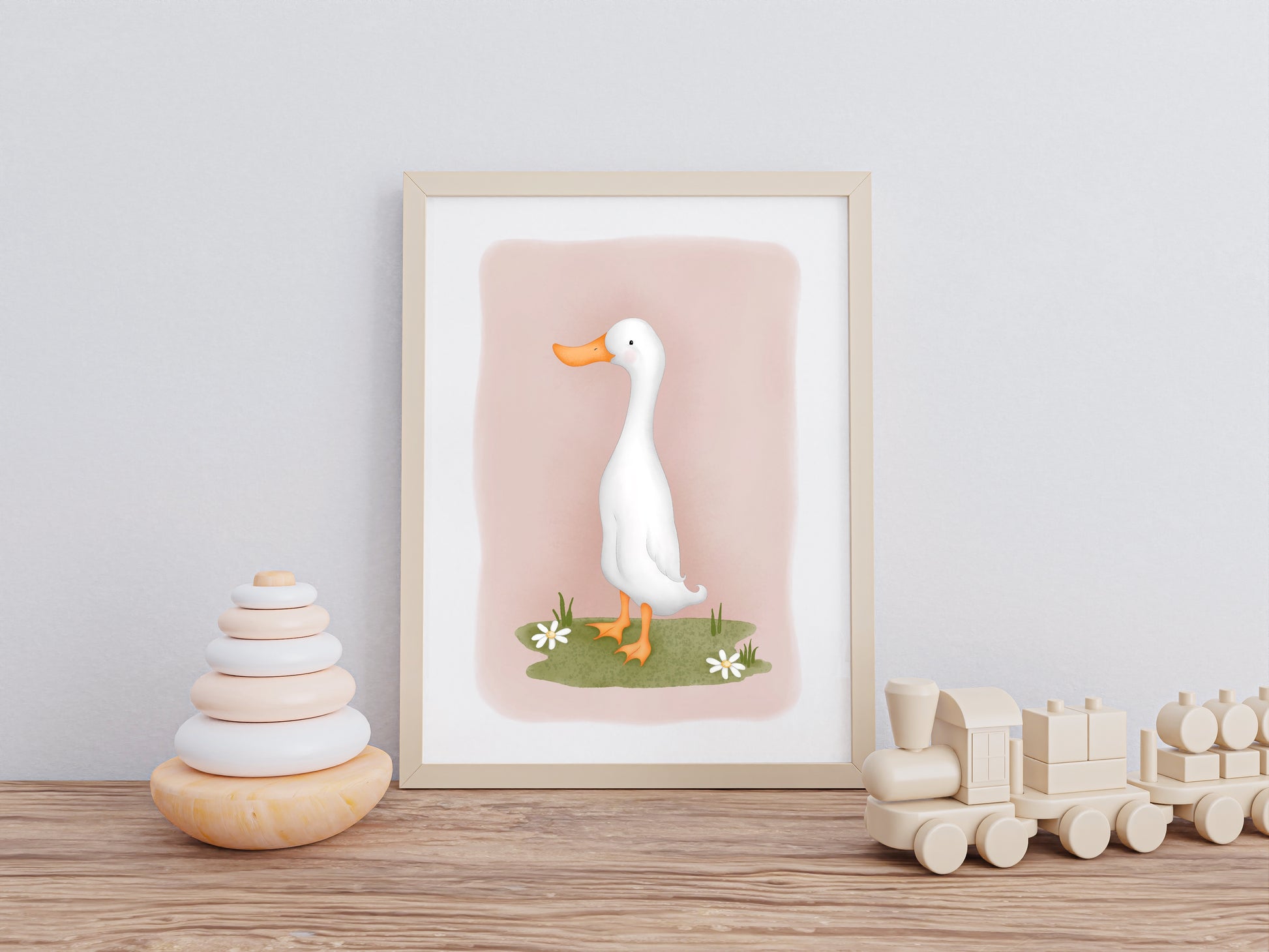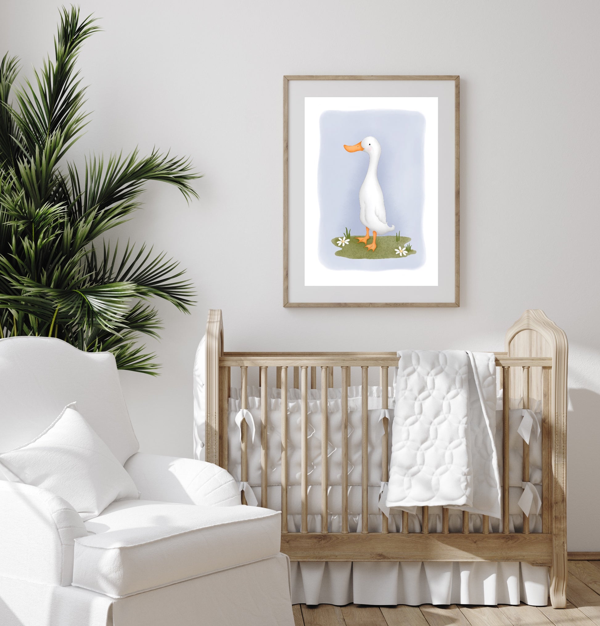 Original artwork by Laura Lawes of Mouse & Meg. Print featuring a cute runner duck standing in a meadow of daisies, perfect for any child’s nursery or playroom.
