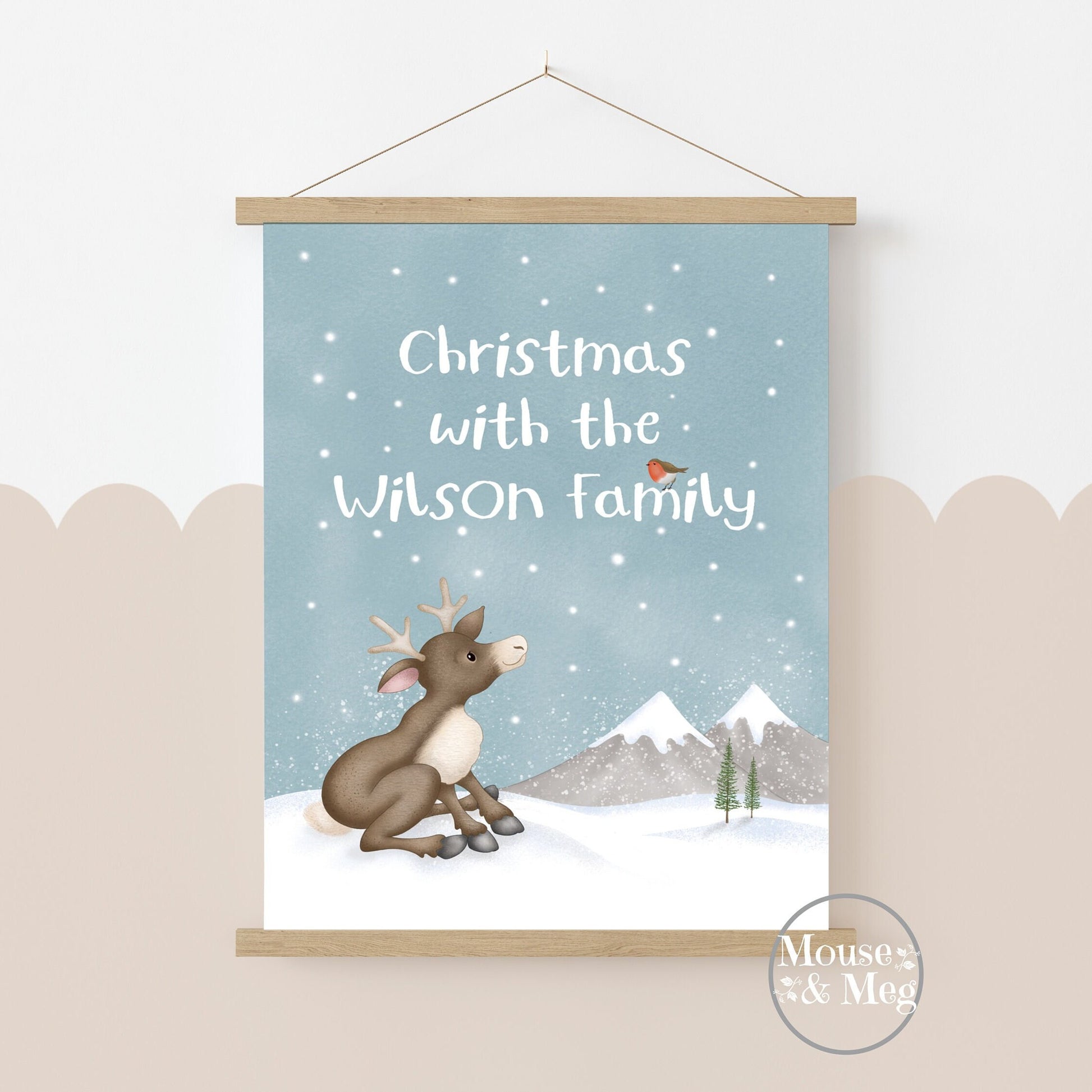 Original artwork by Laura Lawes of Mouse & Meg. With your family name and featuring a reindeer and robin it will add a personal touch to your Christmas Decor.