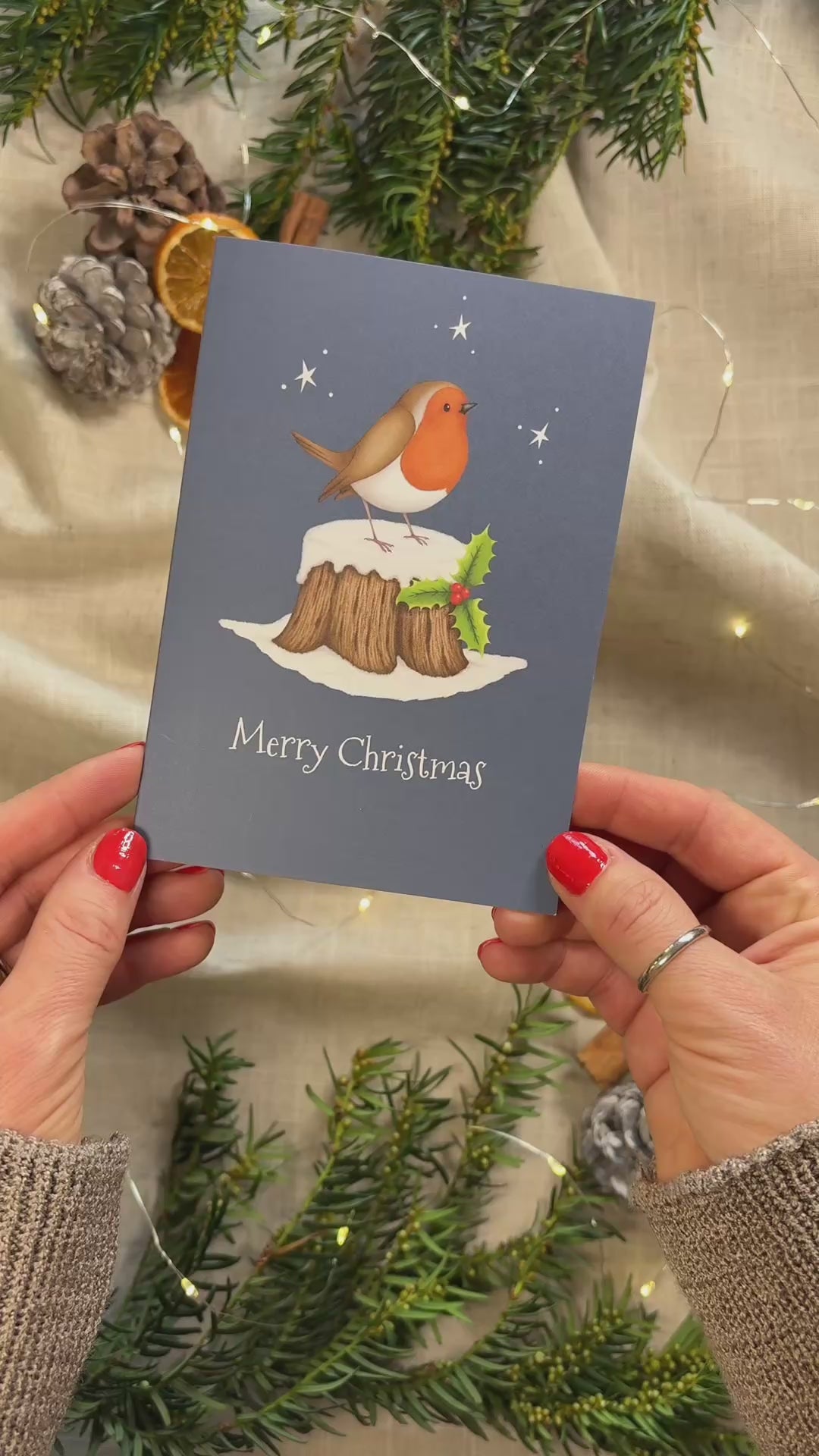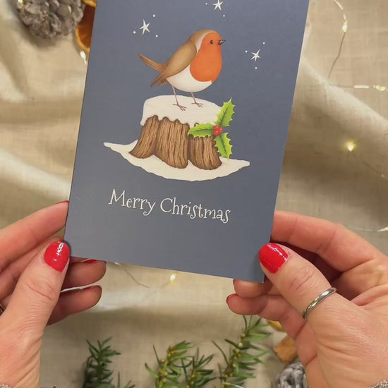 Lovingly designed with artwork by Laura Lawes of Mouse & Meg, this charming Christmas card features a cute robin in the snow, perching on the stump of a holly tree.