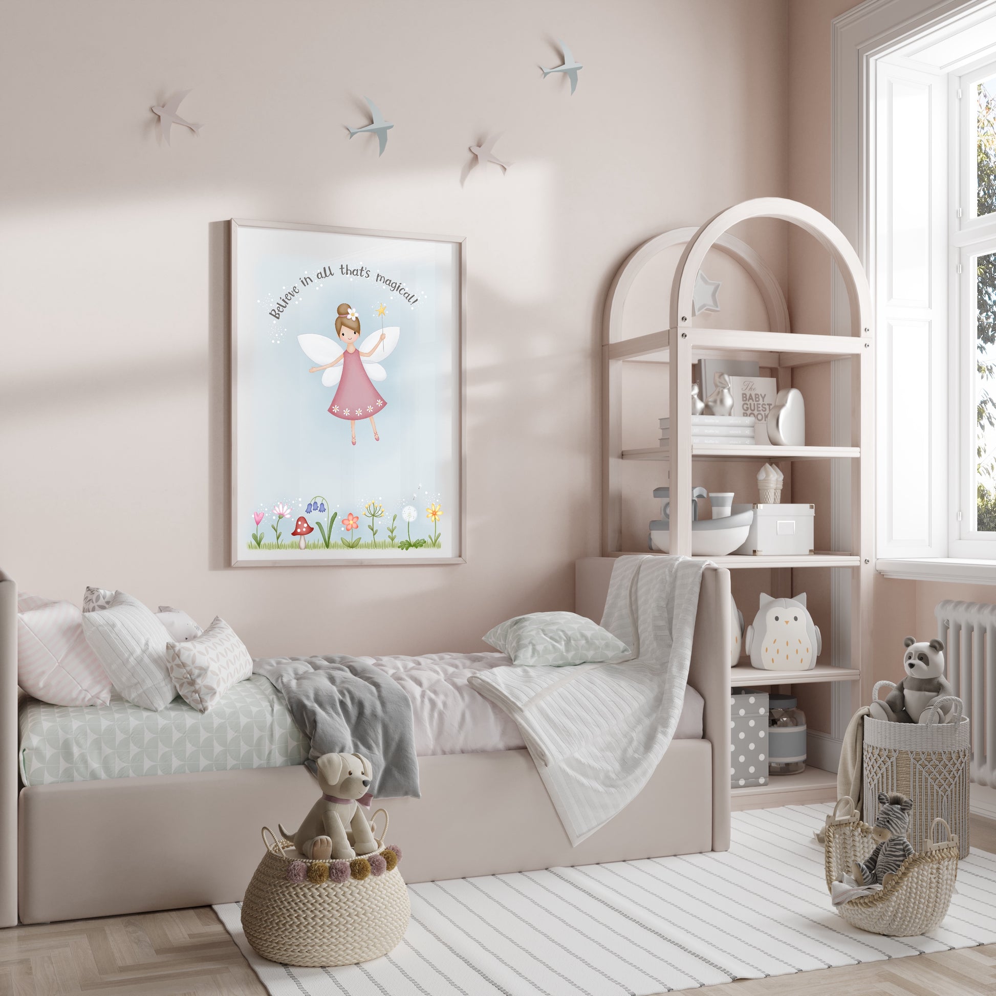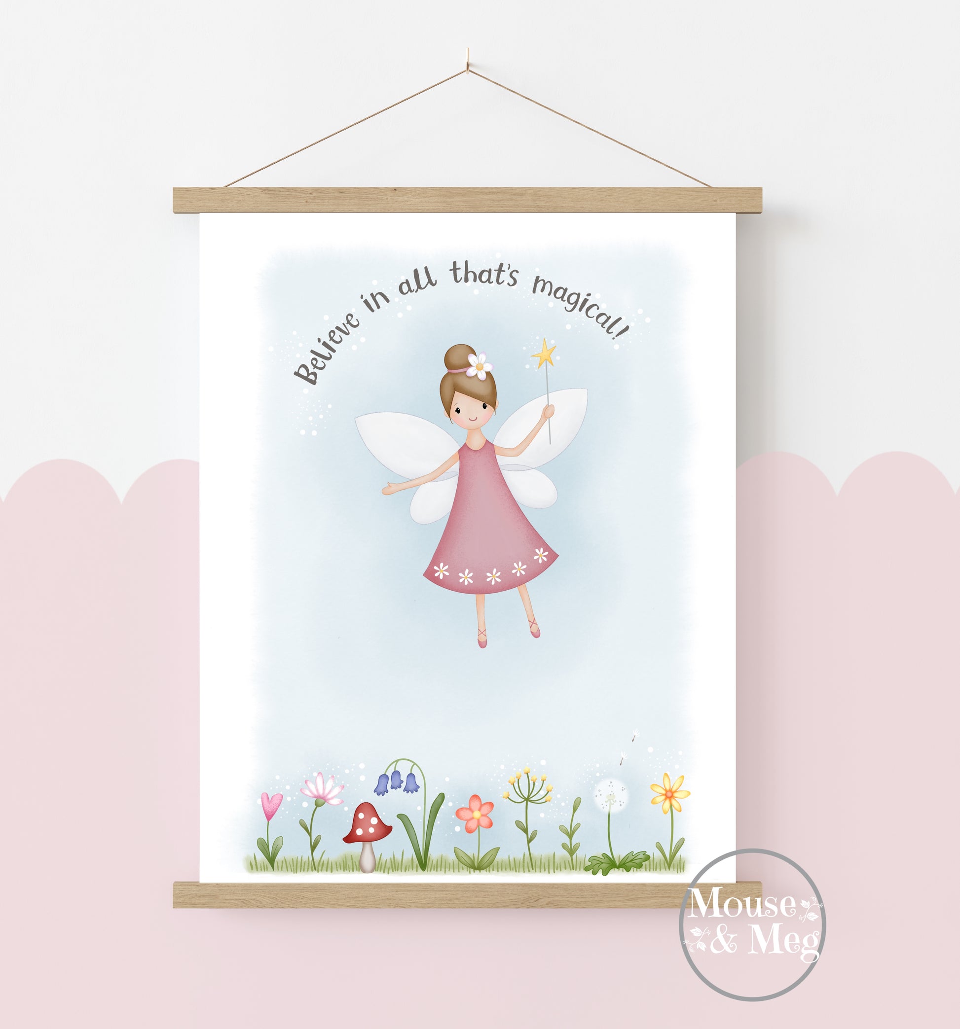 Original artwork by Laura Lawes of Mouse & Meg. Print featuring a pretty woodland fairy fluttering above a woodland meadow and inspirational quote, perfect for any child’s nursery or playroom.